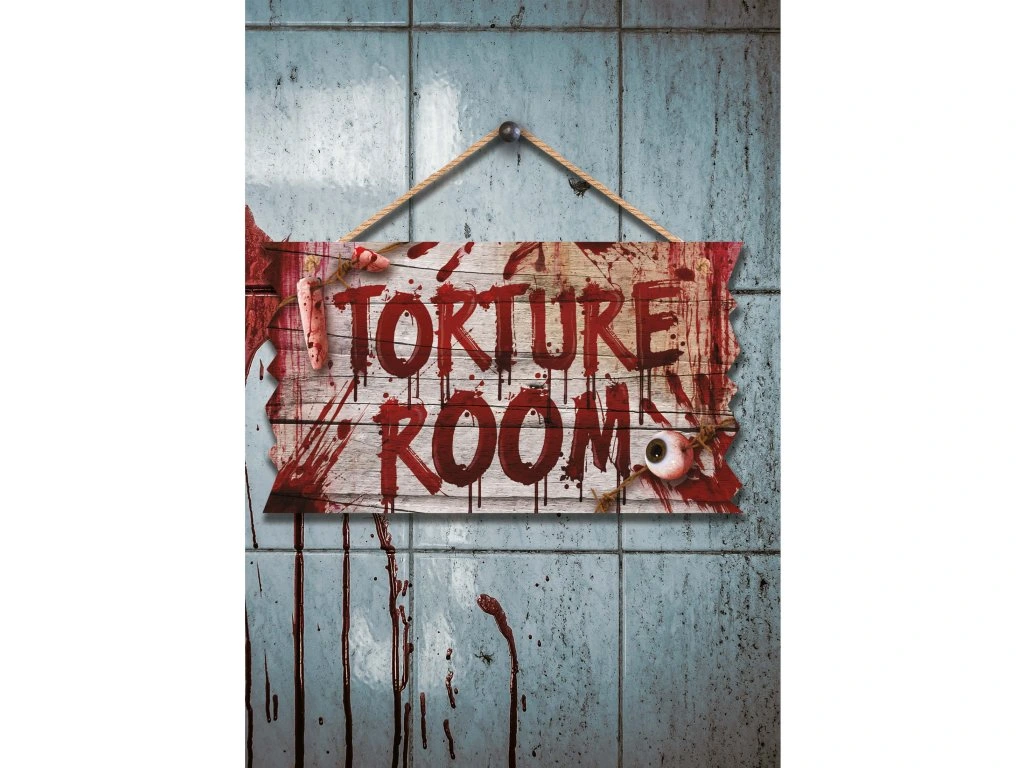 Creați o petrecere de Halloween de neuitat cu ajutorul diferitelor decorațiuni înfricoșătoare. Un accesoriu grozav de Halloween este și această tăbliță cu textul "Torture room", care este potrivită pentru a crea o atmosferă înfricoșătoare pentru orice sărbătoare.