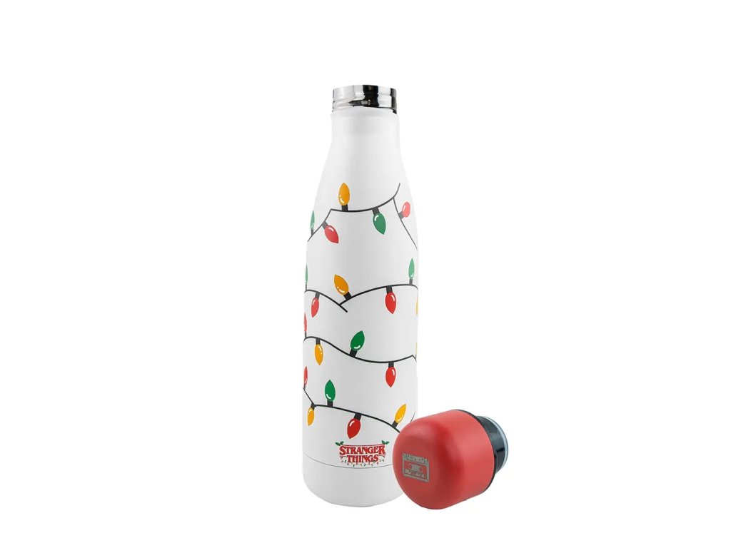 Descoperă magia serialului Stranger Things în fiecare zi cu această termos elegantă pentru băuturi! Designul cu legendaralele lumini de Crăciun îți va însenina ziua chiar și în cele mai întunecate momente – fie că ești la școală, la serviciu sau investighezi mistere în Lumea Răsturnată. Sticla îți menține băutura preferată caldă sau rece, exact așa cum îți place. Cu un volum de 500 ml, este ideală pentru orice aventură. Pregătește-te să primești complimente și nu uita – cu această sticlă vei fi vedeta oricărei petreceri!