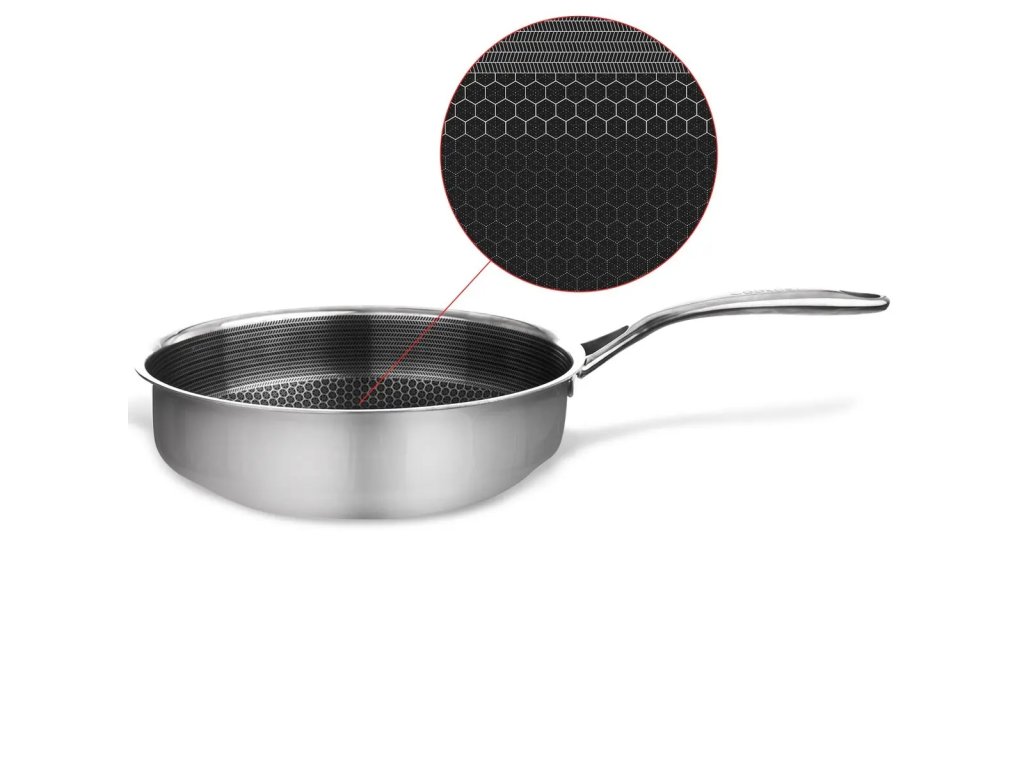 - Construcție cu 3 straturi: strat interior din oțel inoxidabil cu suprafață antiaderentă, strat intermediar din aluminiu și strat exterior din oțel inoxidabil