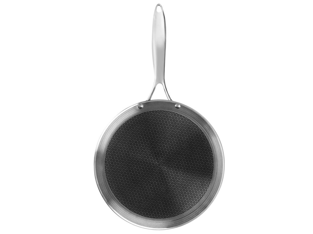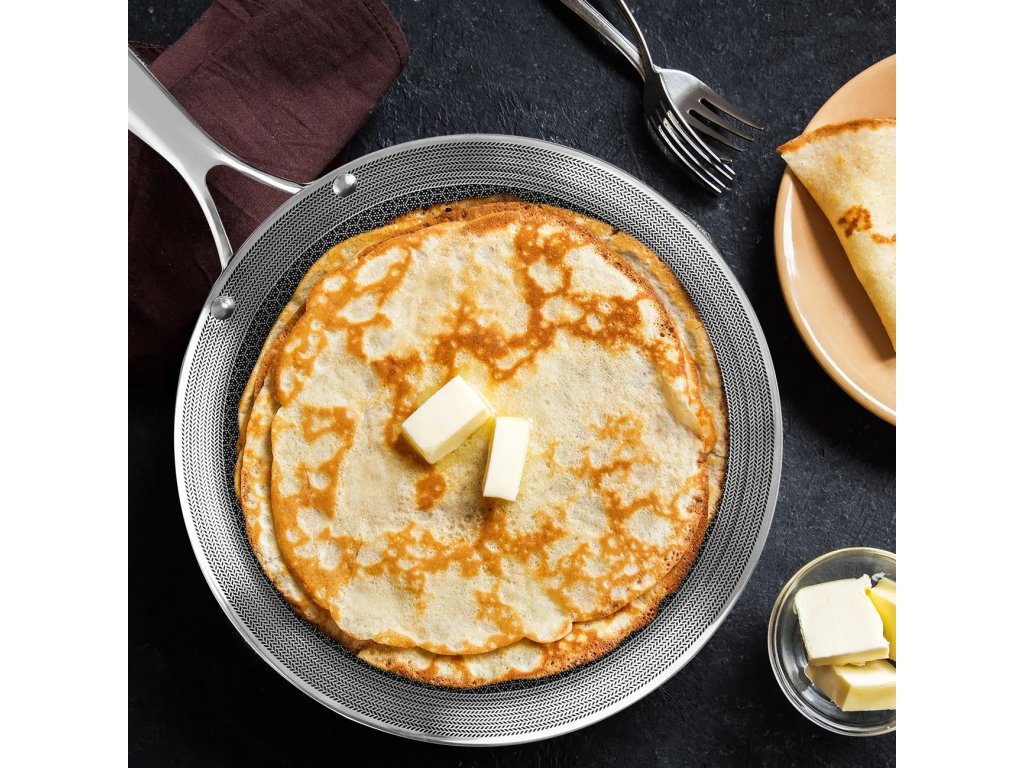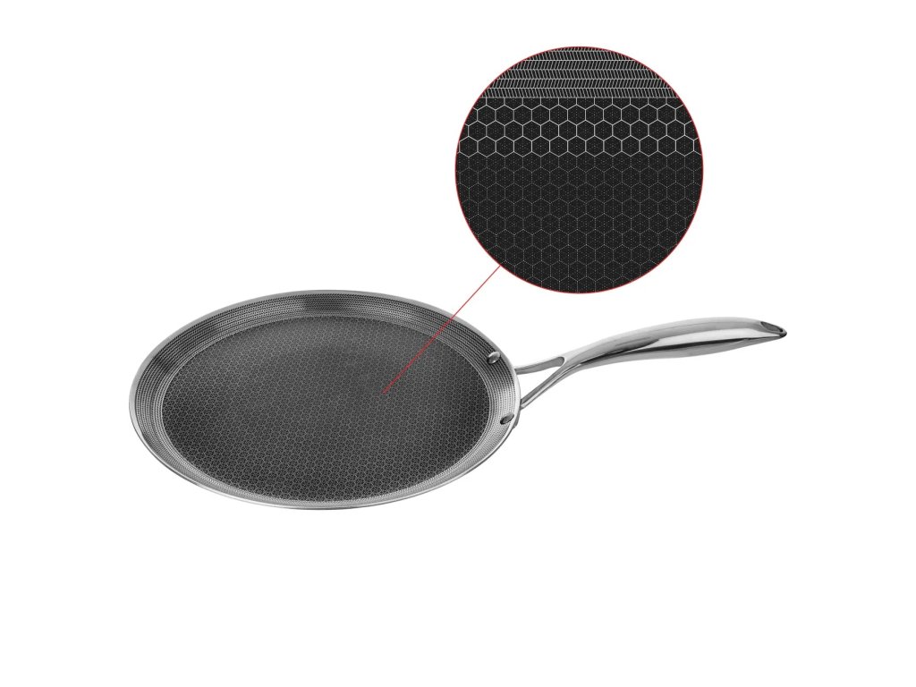 O tigaie practică, ideală pentru prepararea clătitelor, omletelor și plăcintelor. Dispune de un strat antiaderent de înaltă calitate, cu o textură specială asemănătoare fagurelui de miere, și de o țesătură din oțel inoxidabil, care asigură o distribuție uniformă a căldurii și facilitează întoarcerea clătitelor. Cu un diametru de 29 cm, oferă suficient spațiu pentru a găti mai multe clătite simultan. Potrivită atât pentru uz casnic, cât și pentru bucătării profesionale.