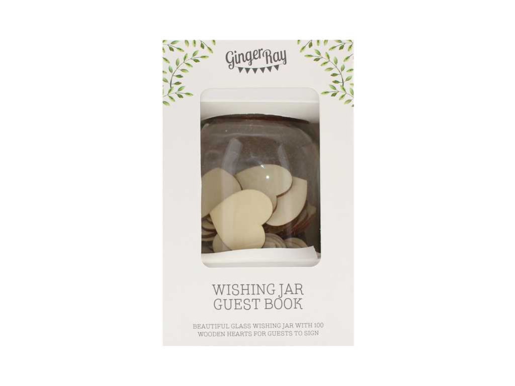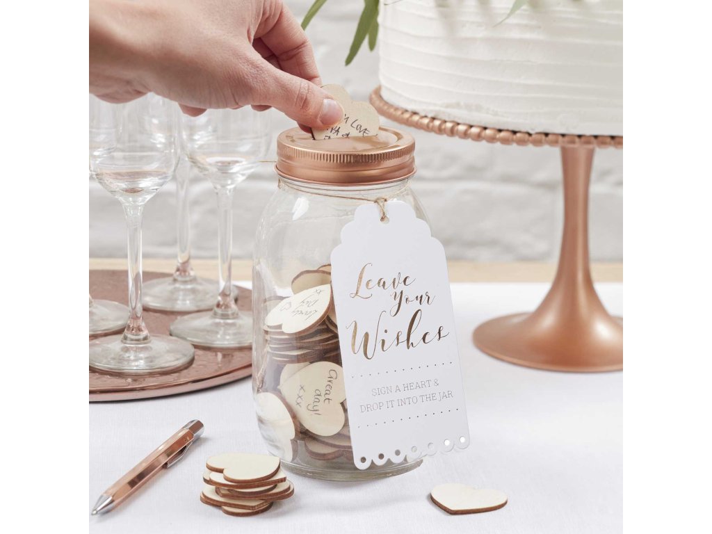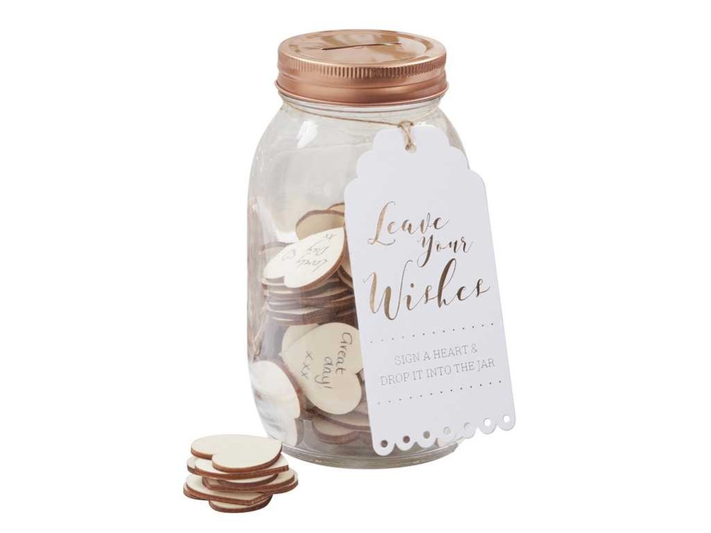 Folosiți acest borcan de dorințe pur și simplu uimitor ca o alternativă la cartea de oaspeți la nunta dvs. Superbul borcan de sticlă este prevăzut cu un capac romantic din aur roz, cu un orificiu și 100 de inimioare din lemn. Invitații dvs. pot scrie urările lor speciale pentru mire și mireasă pe inimile goale și le pot pune în borcan. Prețuiți amintirile dvs. magice pentru anii ce vor urma.