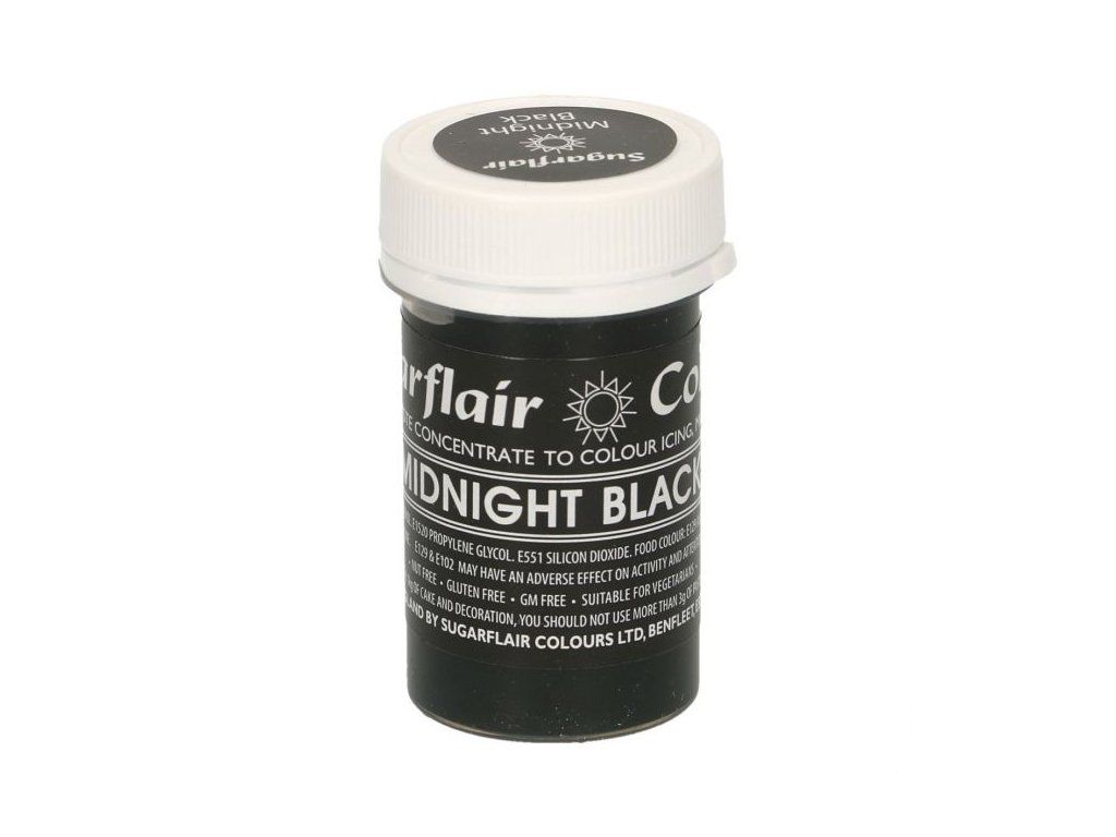 Vopsea gel neagră este un colorant concentrat potrivit pentru colorarea pastelor de modelare și acoperire. Vopseaua comestibilă gel negru este excelentă pentru torturi și prăjituri cu tematică de Halloween. Produsul nu conține gluten și nici ingrediente modificate genetic și este potrivit pentru vegani și vegetarieni.