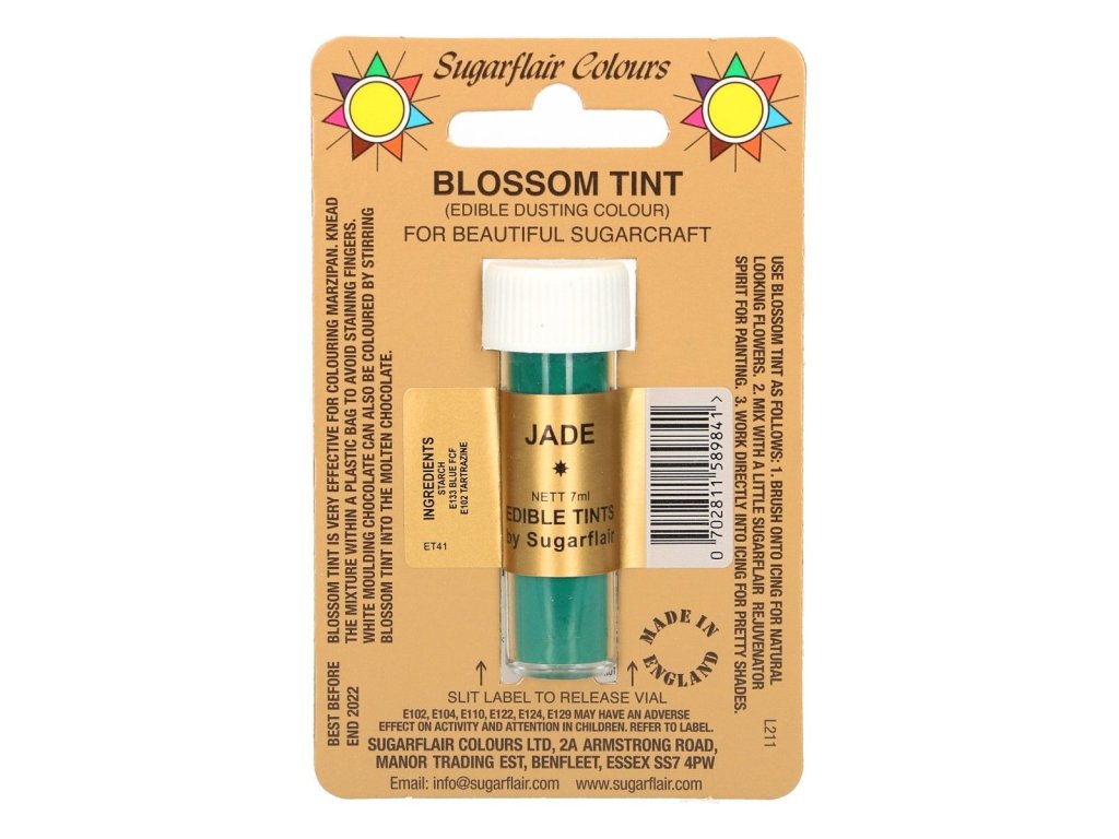 Sugarflair Blossom Tint Jade este o pudră colorantă comestibilă într-o nuanță de jad. Este potrivit pentru crearea de efecte realiste ale produselor fabricate, de ex. petale de fondant. Poate fi folosit și ca vopsea. Se amestecă pudra cu puțin alcool. Se aplica pe suprafata produselor cu o pensula.