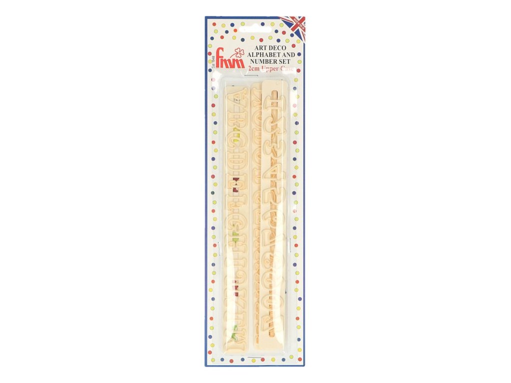 Aceste decupatoare sunt folosite pentru a crea litere și cifre în stilul ART DECO. Conține litere de la A la Z și cifre de la 0 la 9. Literele au o dimensiune de aproximativ 2 cm. Formele pot fi decupate din paste de acoperire și modelare.